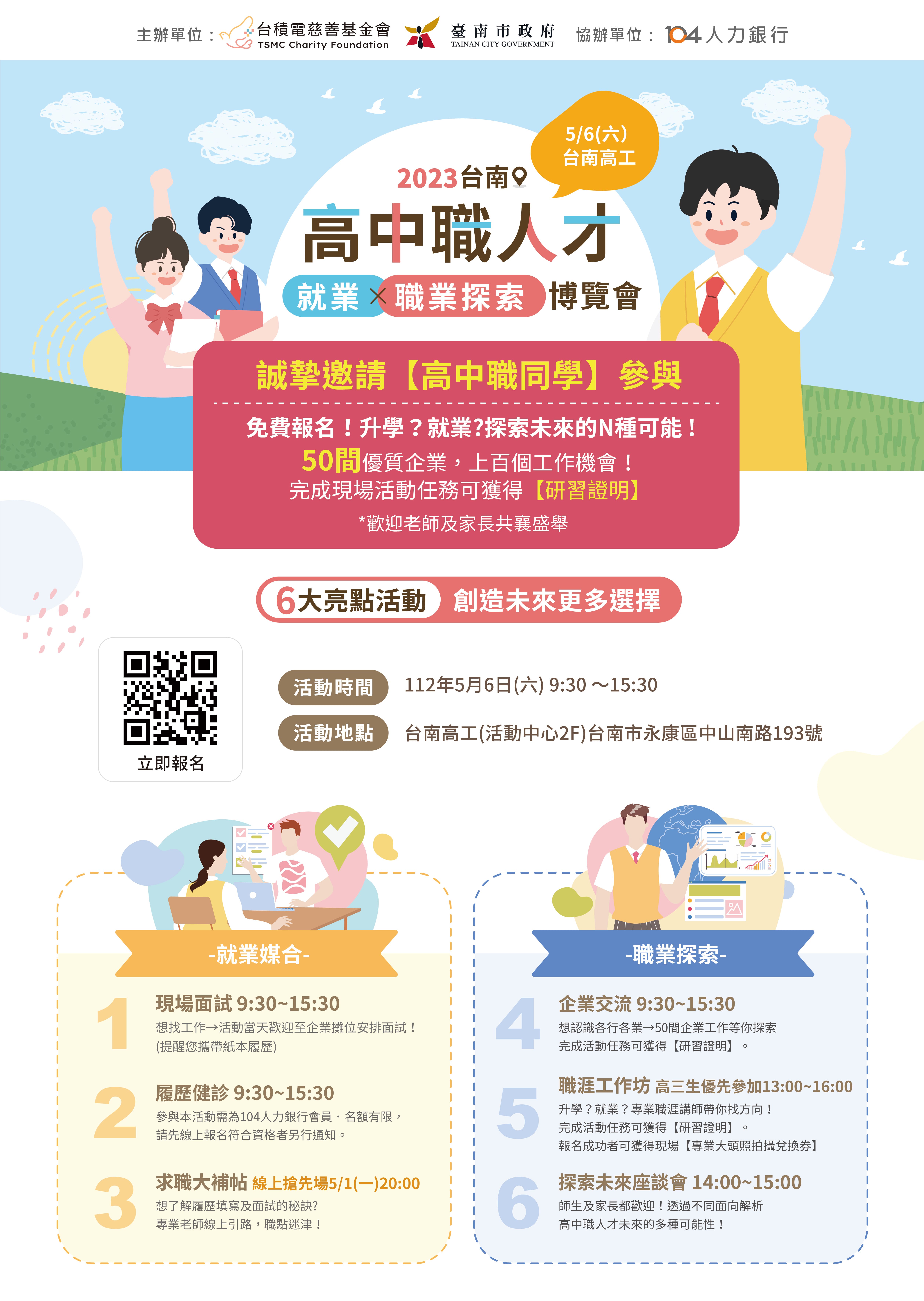 一、本市與台積電慈善基金會合辦「2023台南高中職人才就業X職業探索博覽會」,將於112年5月6日(週六)在國立臺南高級工業職業學校辦理。