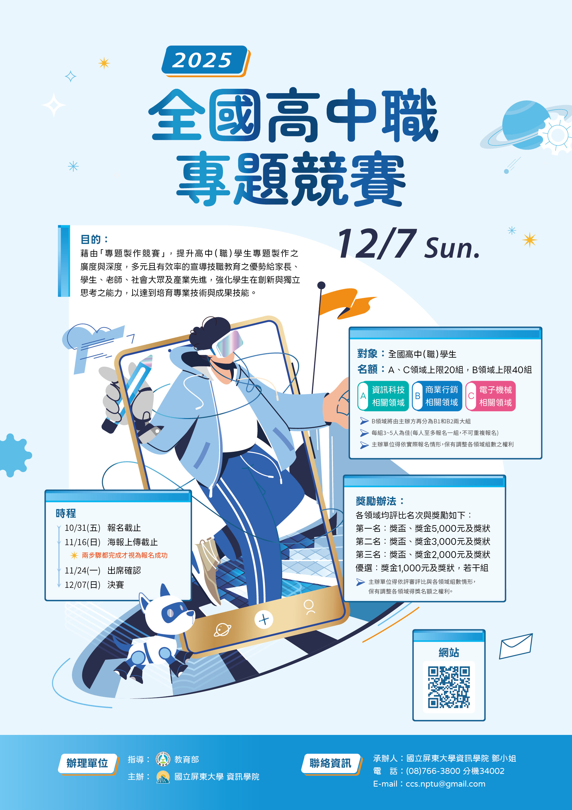 檢送國立屏東大學資訊學院舉辦「2025全國高中職專題競賽」活動 簡章、海報及常見問題各1份