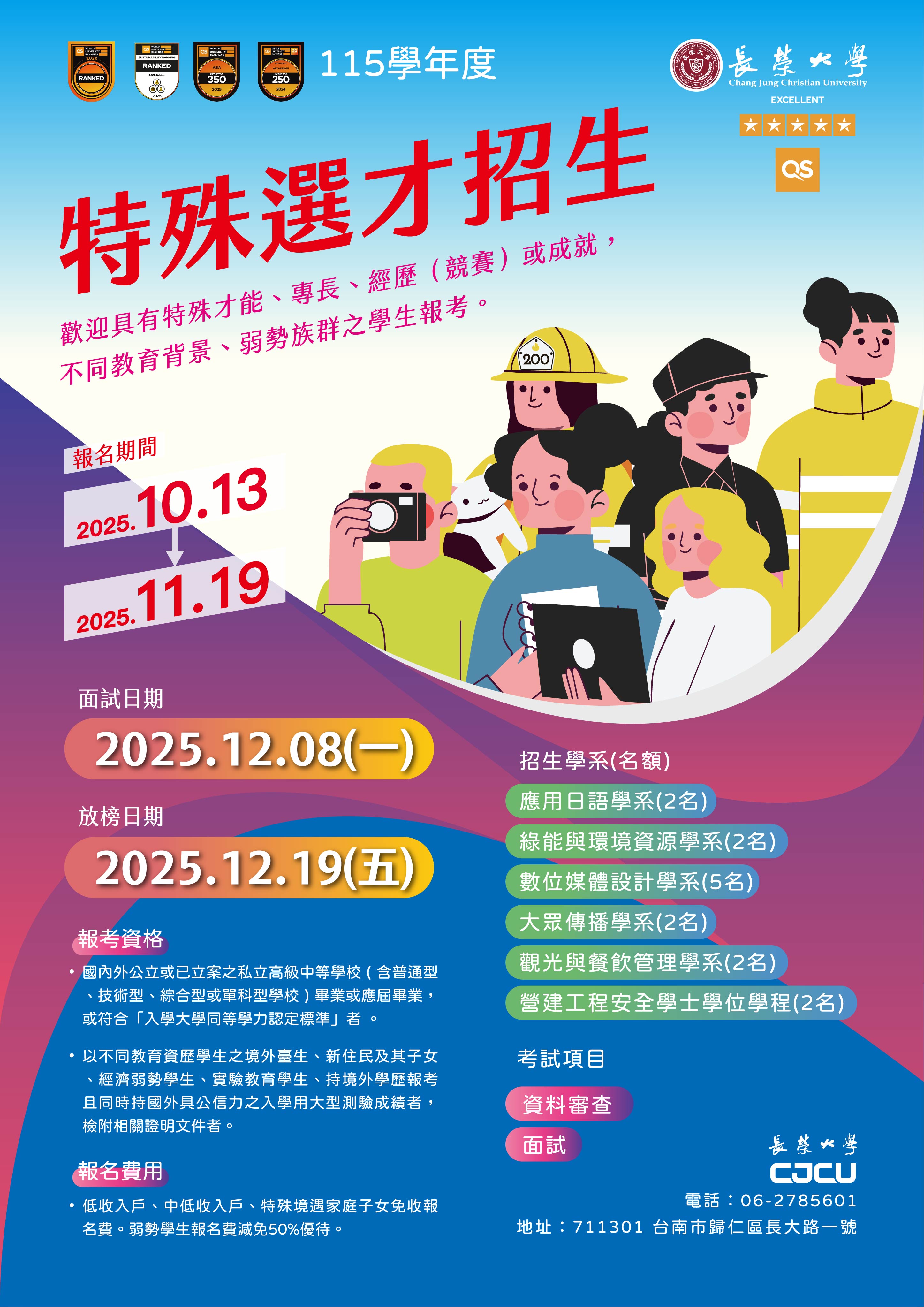 一、本校為鼓勵具特殊才能、專長、經歷(競賽)或成就,不同教育背景及弱勢族群之學生進入大學就讀,特辦理115學年度特殊選才招生。 二、特殊選才重要期程如下: (一)報名日期:2025年10月13日至11月19日 (二)面試日期:2025年12月8日(星期一) (三)放榜日期:2025年12月19日(星期五) 三、檢附招生簡章電子檔乙份,敬請轉知貴校師生參考。