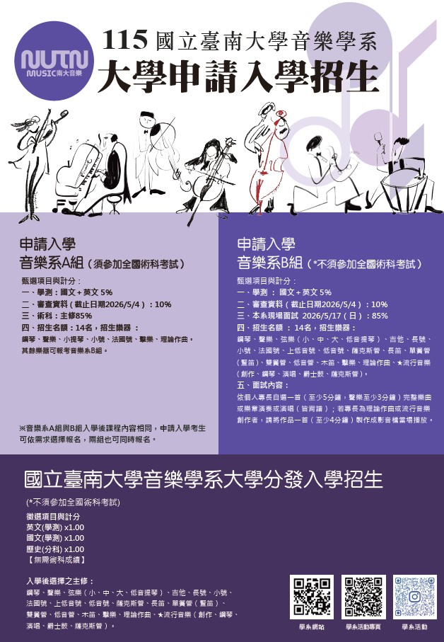 一、國立臺南大學音樂系自113學年度起,於申請入學階段增設音樂系B組招生類別,不採計全國音樂術科測驗成績,主修樂器涵蓋古典、流行、爵士等多元領域,並結合東京ESP流行音樂院之師資與課程合作,打造跨國流行音樂專業學習環境,誠摯歡迎對音樂學習具高度熱忱之同學踴躍報考。 二、相關招生資訊可電洽國立臺南大學音樂學系辦公室。洽詢電話:06-2133111分機712。
