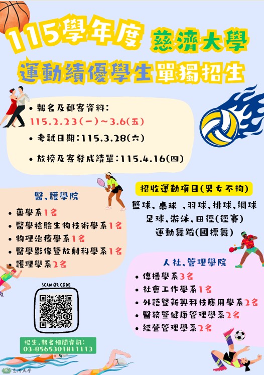 一、本校115學年度運動績優學生單獨招生招生簡章自114年12 月10日(星期三)起可免費上網下載。